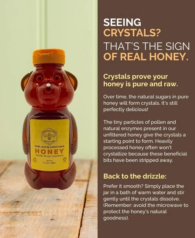 - Please Note: All natural honey will crystallize over time. To reliquefy, simply place the bottle in warm water (not to exceed 120°F). Do not feed honey to infants under one year of age.